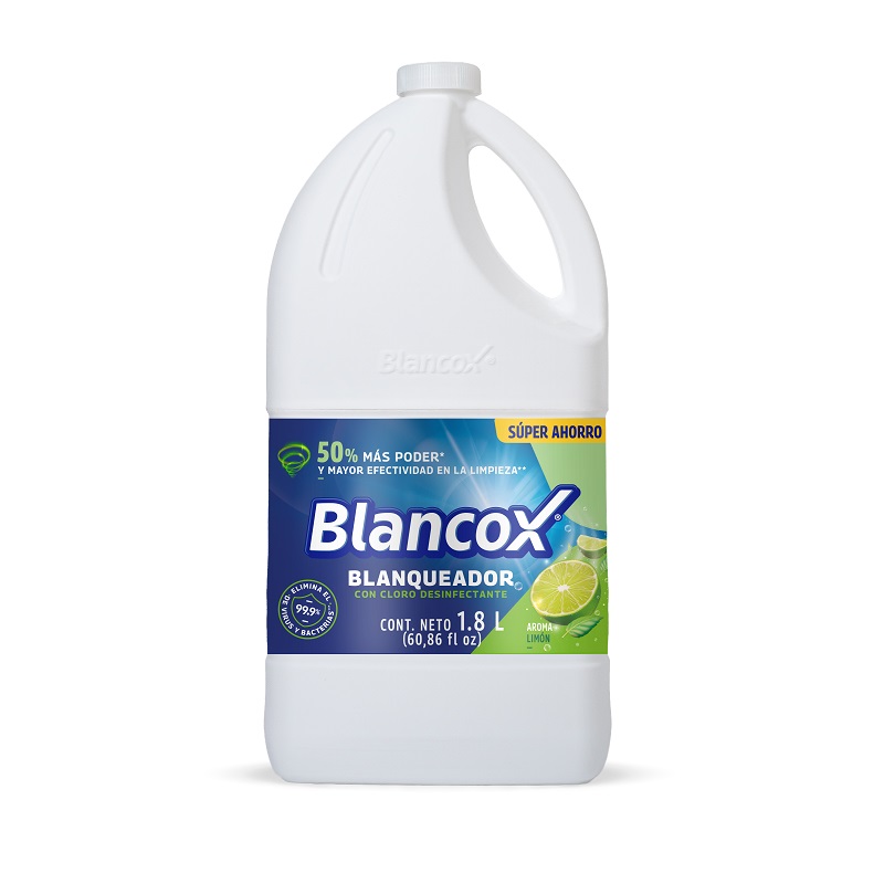 El blanqueador desinfectante Blancox Limón Fusión de 1,8 litros limpia, desinfecta y blanquea en una sola aplicación. Su fragancia cítrica a limón deja un aroma fresco y vigoroso mientras elimina el 99,9% de gérmenes y bacterias en pisos, baños y superficies del hogar.