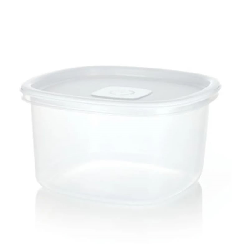 Recipiente transparente cuadrado con capacidad para 1,5 litros, tapa blanca.